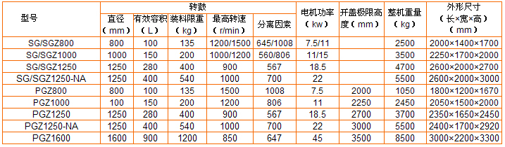 SGZ/PGZ型离心机可按使用要求设定程序,自动完成进料、分离洗涤、脱水、卸料等工序,可实现远、近距离 操作。具有自动化程度高、处理量大、分离效果好。