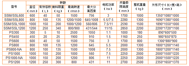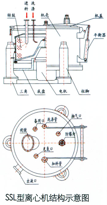 | SSL/SSM离心机均为人工上卸料密闭,间歇操作的过滤设备。物料由上部加入转鼓,物料由上部加入转鼓,在离心力场作用下,液相穿过过滤介质排出机外,固相物截留在转鼓内,停机后打开机盖从上部卸料,具有运转平稳、操作简便和进料,洗涤,脱水在密闭状态下进行等特点。