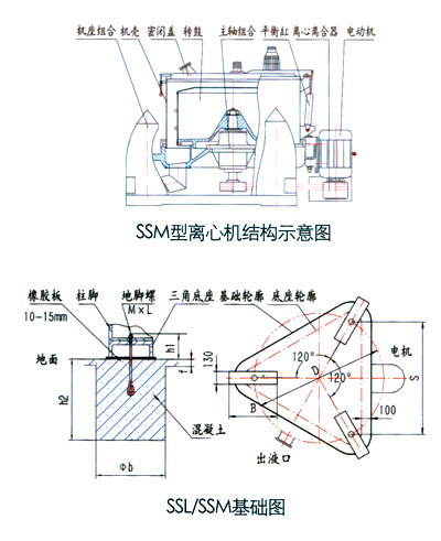 SSL型三足式直联离心机转鼓直接装在电机轴上,无离合器,三角带,机械制动部件,特别适用于易燃,易爆,有毒的物料分离.