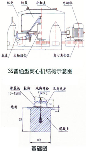 | SS/SSJ型离心机均为三足式上部卸料,间歇操作的过滤设备.物料由上部加入转鼓,在离心力场的作用下,液相穿过过滤介质排出机外,固相物截留在转鼓内,停机后由人工从上部卸料.具有结构简单,操作方便,物料不易破碎,通用性强等特点.